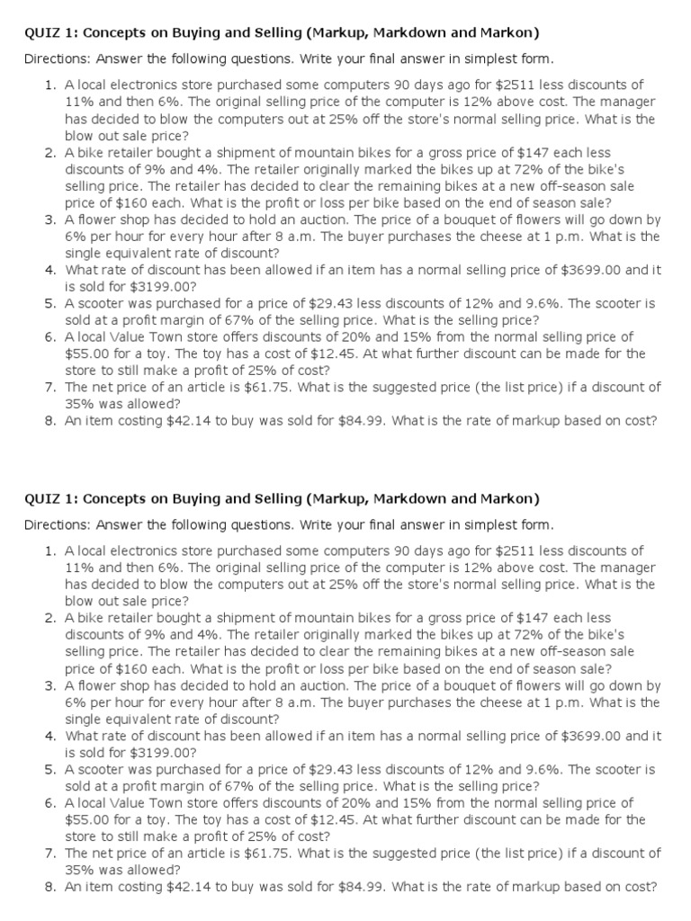QUIZ 1: Concepts on Buying and Selling (Markup, Markdown and Markon)