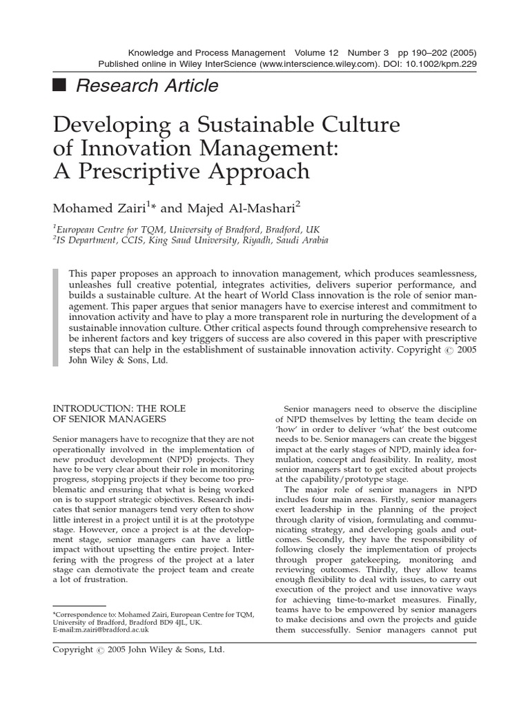 Developing A Sustainable Culture of Innovation Management: A Prescriptive Approach