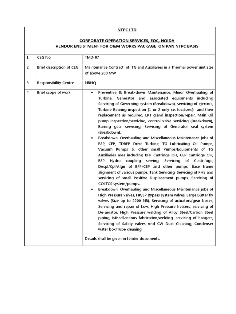 VENDOR ENLISTMENT FOR O&M WORKS PACKAGE ON PAN NTPC BASIS