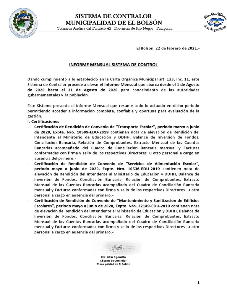 Sistema de Contralor procede a elevar el Informe Mensual que abarca desde el 1 de Agosto