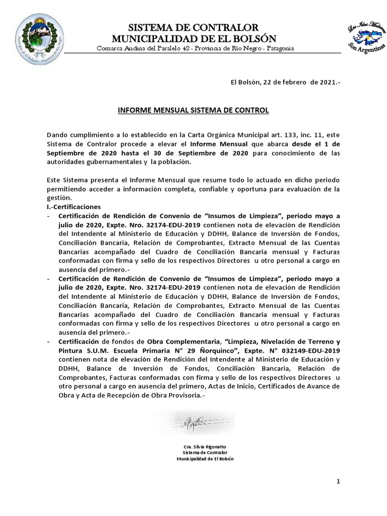 Sistema de Contralor procede a elevar el Informe Mensual que abarca desde el 1 de