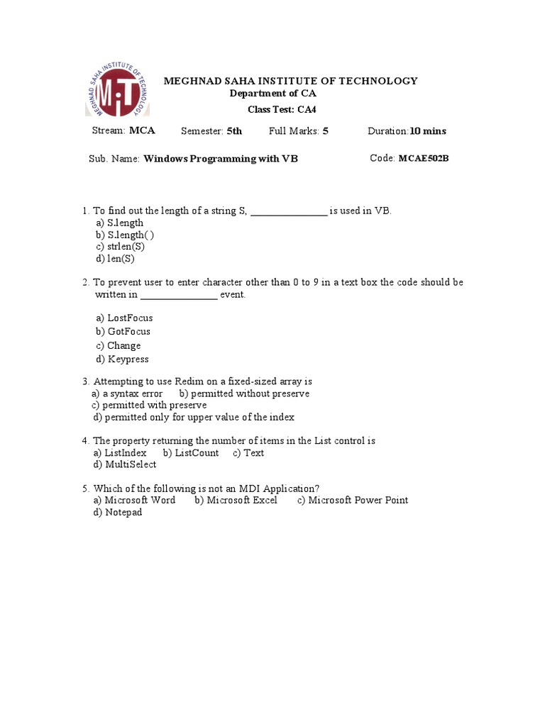 Sub. Name: Windows Programming with VB Code: MCAE502B