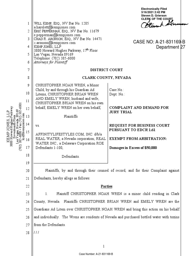 CHRISTOPHER NOAH WREN, a Minor Child, by and through his Guardian Ad Litems, CHRISTOPHER BRIAN WREN AND EMELY WREN, husband and wife; CHRISTOPHER BRIAN WREN on his own behalf; EMELY WREN on her own behalf, Plaintiffs vs. AFFINITYLIFESTYLES.COM, INC. d/b/a REAL WATER, a Nevada corporation; REAL WATER INC., a Delaware Corporation ROE Defendants 1-100, Defendants. Case No.: Dept. No.: