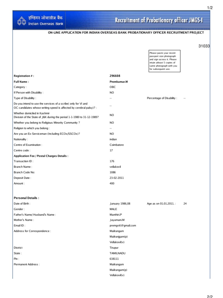 ON-LINE APPLICATION FOR INDIAN OVERSEAS BANK PROBATIONARY OFFICER RECRUITMENT PROJECT