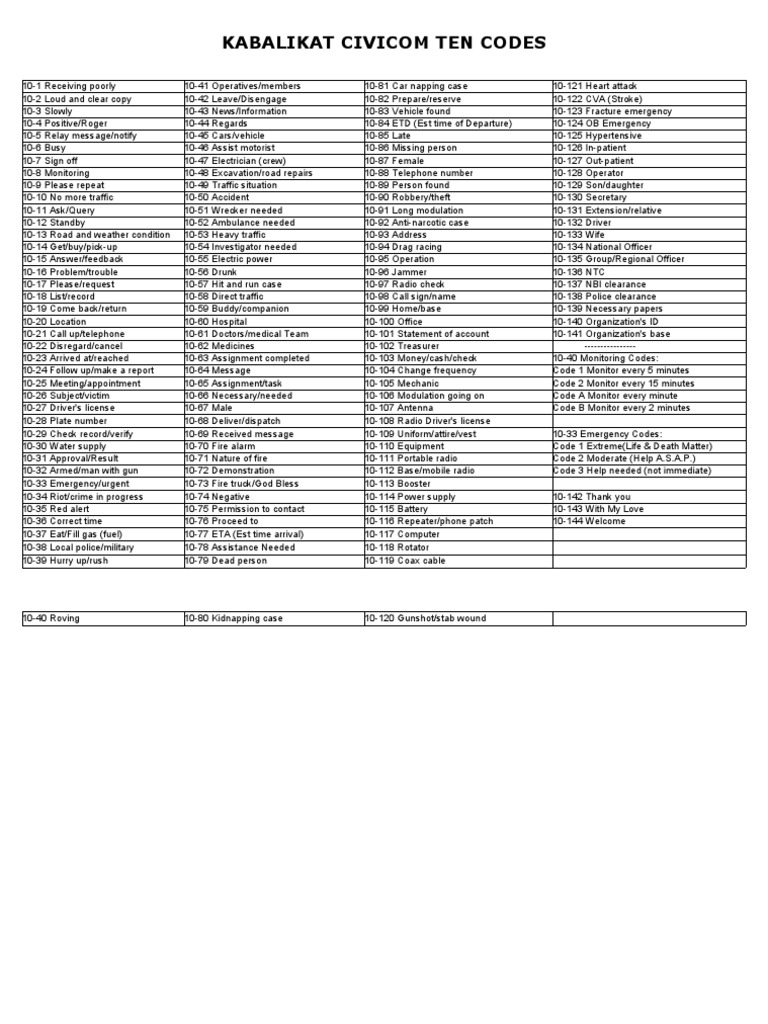 10-17 Please/request 10-57 Hit and run case 10-97 Radio check 10-137 NBI clearance