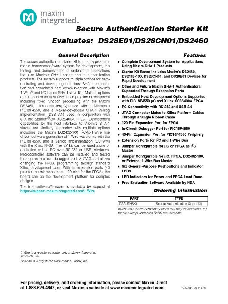 Evaluates: DS28E01/DS28CN01/DS2460 Secure Authentication Starter Kit