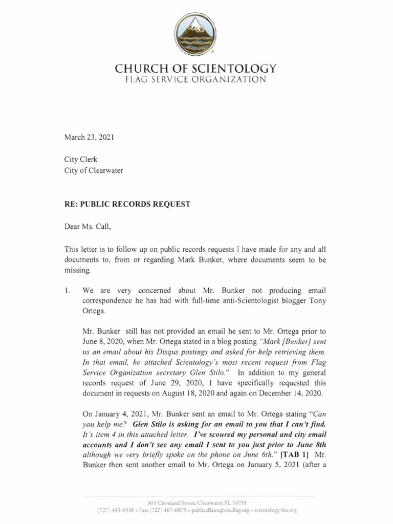 that email, he attached Scientology's most recent request from Flag Service Organization secretary Glen Stilo.