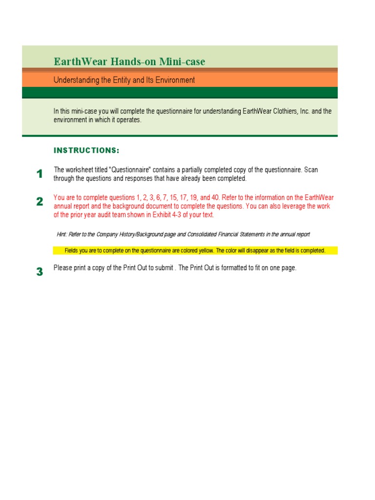In this mini-case you will complete the questionnaire for understanding EarthWear Clothiers, Inc. and the