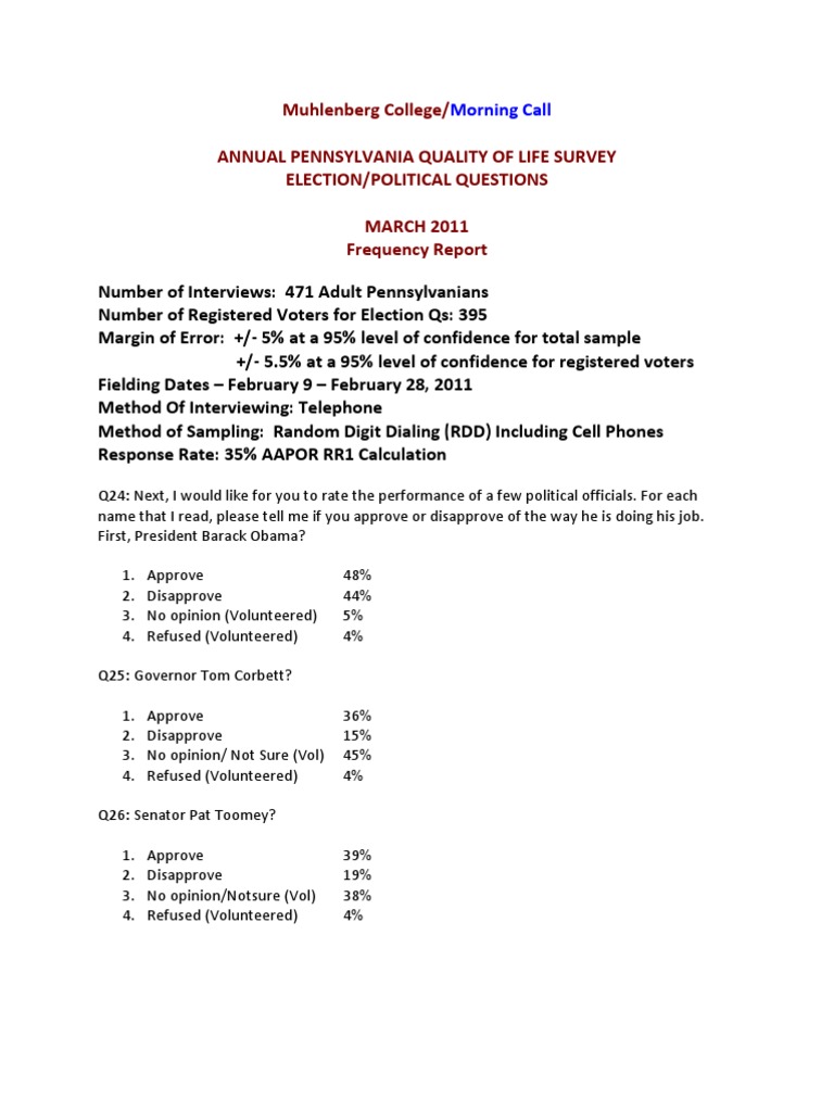 REPORT Muhlenberg/TMC Annual Pa Quality of Life Survey (Election/Political Questions), March 2011