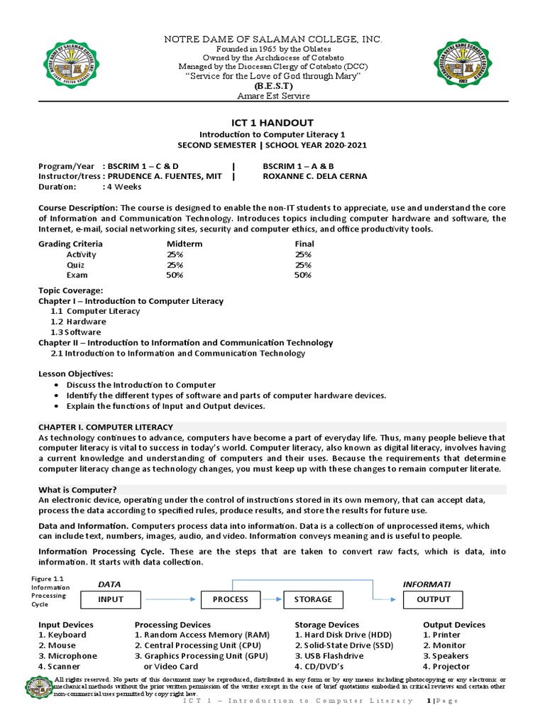 Ict 1 Handout: Notre Dame of Salaman College, Inc