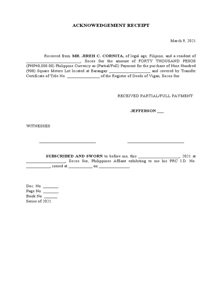 (PHP40,000.00) Philippine Currency as (Partial/Full) Payment for the purchase of Nine Hundred