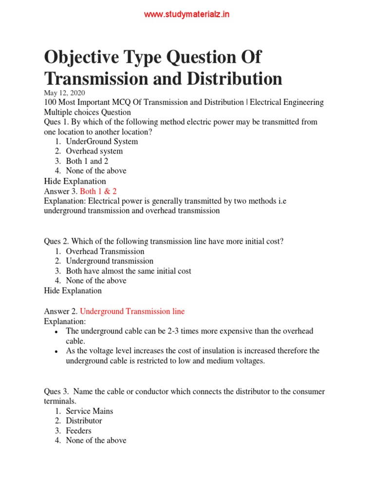 100 Most Important MCQ Of Transmission and Distribution | Electrical Engineering