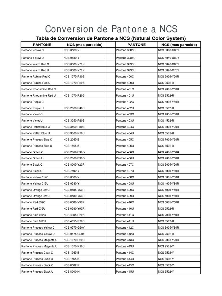 Tabla de Conversion de Pantone a NCS (Natural Color System)