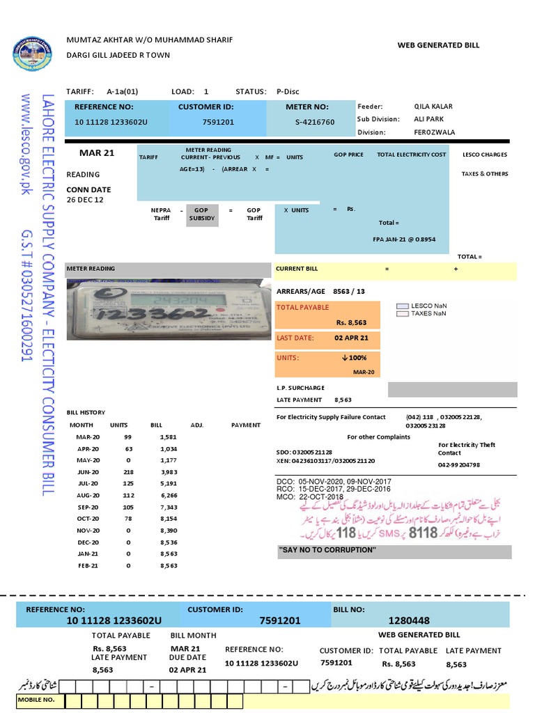 MAR 21 TARIFF CURRENT - PREVIOUS X MF = UNITS GOP PRICE TOTAL ELECTRICITY COST LESCO CHARGES