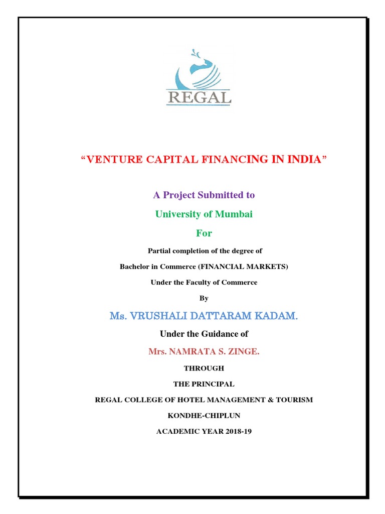 entitled,“VENTURE CAPITAL FINANCING IN INDIA” under my supervision.