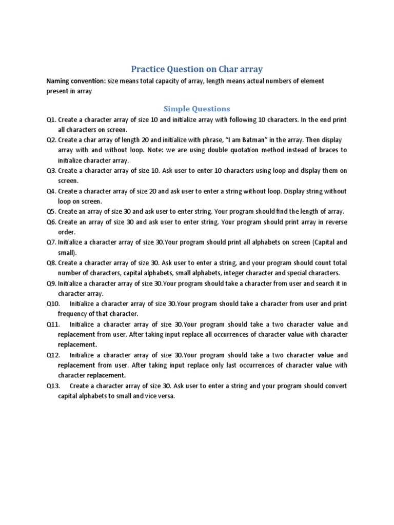 Q1. Create a character array of size 10 and initialize array with following 10 characters. In the end print
