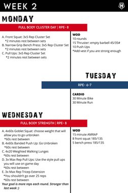Cycle 1: Week 2: Continues the training with the second week's detailed workout routines and objectives.