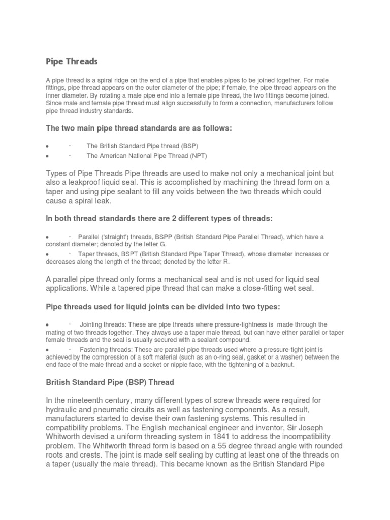 Types of Pipe Threads Pipe threads are used to make not only a mechanical joint but