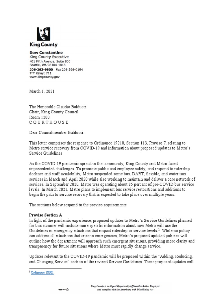 March 1, 2021 The Honorable Claudia Balducci Chair, King County Council Room 1200 C O U R T H O U S E Dear Councilmember Balducci: This letter comprises the response to Ordinance 19210, Section 113, Proviso 7, relating to Metro service recovery from COVID-19 and information about proposed updates to Metro’s Service Guidelines As the COVID-19 pandemic spread in the community, King County and Metro faced unprecedented challenges. To promote public and employee safety, and respond to ridership declines and staff availability, Metro suspended some bus, DART, flexible, and water taxi services in March and April 2020 while also working to maintain and deliver a core network of services. In September 2020, Metro was operating about 85 percent of pre-COVID bus service levels. In March 2021, Metro plans to implement bus service restorations and additions to begin the path to service recovery that is expected to take place over multiple years. The sections below respond to the proviso requirements.