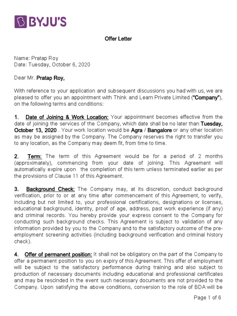 Think & Learn Pvt. Ltd. Accept Job Offer by signing below