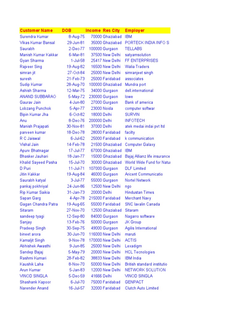 Customer Name DOB Income Res City Employer