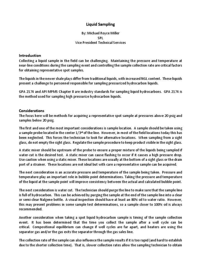 GPA 2174 and API MPMS Chapter 8 are industry standards for sampling liquid hydrocarbons. GPA 2174 is