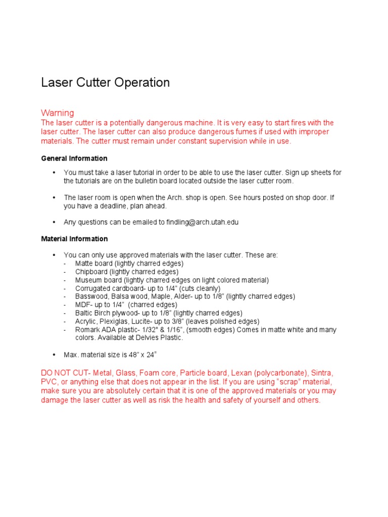 damage the laser cutter as well as risk the health and safety of yourself and others.