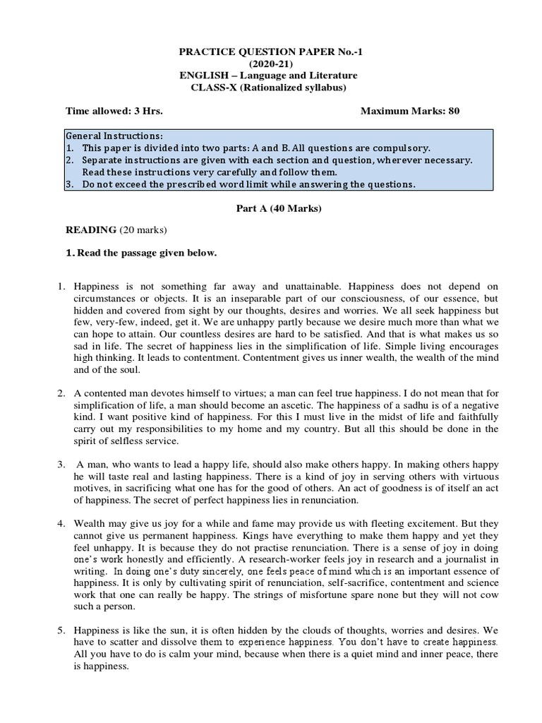 Practice Question Paper No.-1 (2020-21) ENGLISH - Language and Literature CLASS-X (Rationalized Syllabus) Time Allowed: 3 Hrs. Maximum Marks: 80
