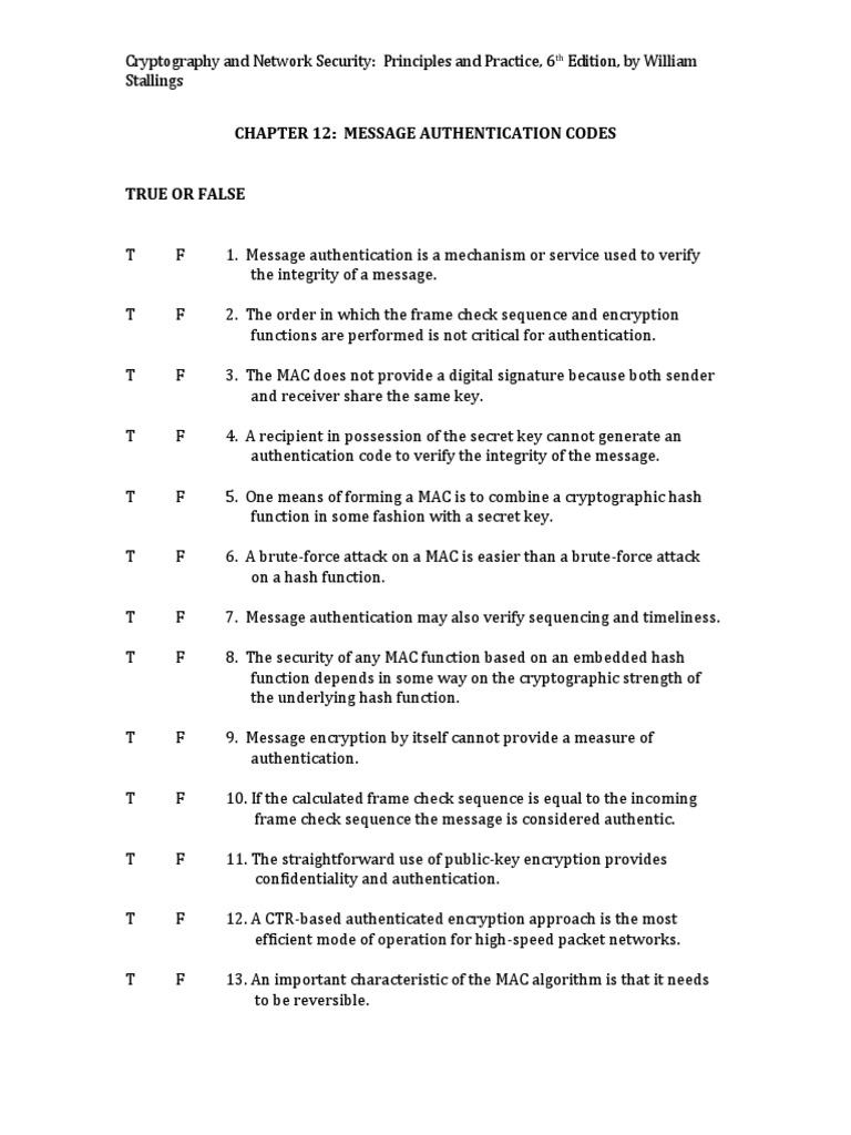 T F 7. Message authentication may also verify sequencing and timeliness.