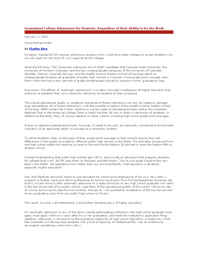 Synopsis: Senate Bill 59 imposes admissions quotas which would force state colleges to accept students who