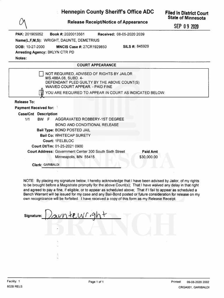 Daunt Wright Law Enforcement Notice of Release and Appearance September 2020