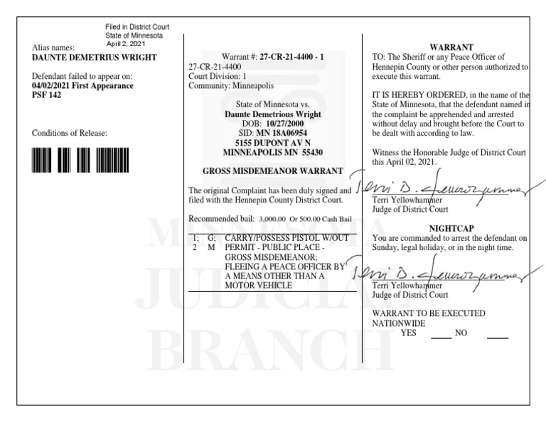 DAUNTE DEMETRIUS WRIGHT Warrant #: 27-CR-21-4400 - 1 TO: The Sheriff or any Peace Officer of