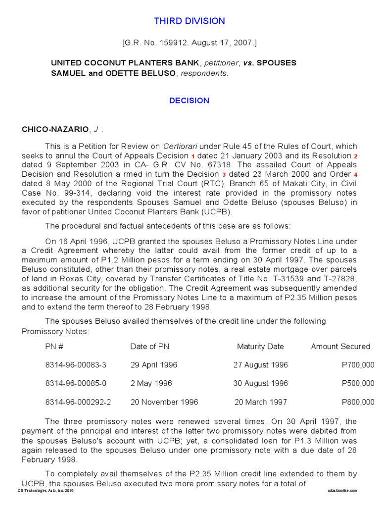 On 16 April 1996, UCPB granted the spouses Beluso a Promissory Notes Line under