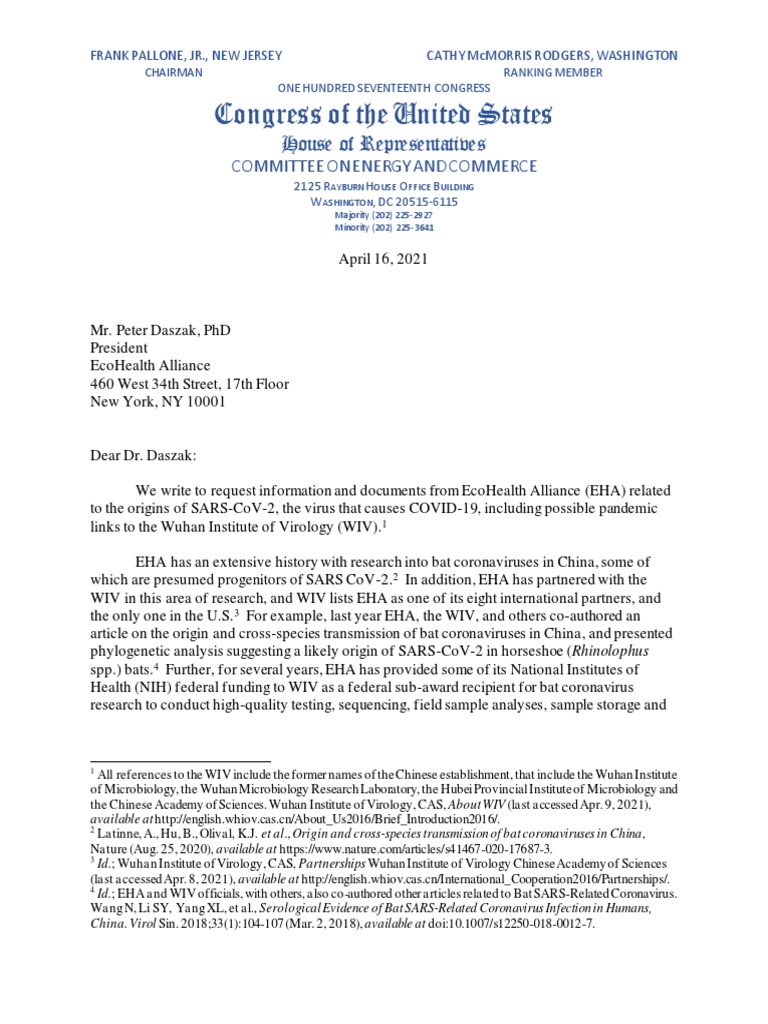 April 16, 2021 Mr. Peter Daszak, PhD President EcoHealth Alliance 460 West 34th Street, 17th Floor New York, NY 10001 Dear Dr. Daszak: We write to request information and documents from EcoHealth Alliance (EHA) related to the origins of SARS-CoV-2, the virus that causes COVID-19, including possible pandemic links to the Wuhan Institute of Virology (WIV).