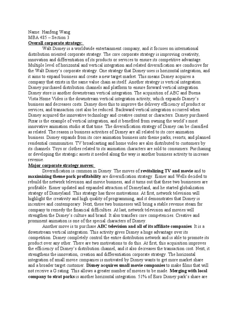 the Walt Disney’s corporate strategy. One strategy that Disney uses is horizontal integration, and