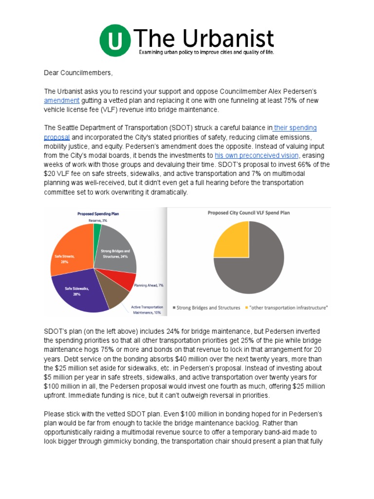 Dear Councilmembers,The Urbanist asks you to rescind your support andoppose Councilmember Alex Pedersen’samendmentgutting a vetted plan and replacing it onewith one funneling at least 75% of newvehicle license fee (VLF) revenue into bridge maintenance.The Seattle Department of Transportation (SDOT) strucka careful balance intheir spendingproposaland incorporated the City's stated prioritiesof safety, reducing climate emissions,mobility justice, and equity. Pedersen’s amendmentdoes the opposite. Instead of valuing inputfrom the City’s modal boards, it bends the investmentstohis own preconceived vision, erasingweeks of work with those groups and devaluing theirtime. SDOT’s proposal to invest 66% of the$20 VLF fee on safe streets, sidewalks, and activetransportation and 7% on multimodalplanning was well-received, but it didn’t even geta full hearing before the transportationcommittee set to work overwriting it dramatically.SDOT’s plan (on the left above) includes 24% for bridgemaintenance, but Pedersen invertedthe spending priorities so that all other transportationpriorities get 25% of the pie while bridgemaintenance hogs 75% or more and bonds on that revenueto lock in that arrangement for 20years. Debt service on the bonding absorbs $40 millionover the next twenty years, more thanthe $25 million set aside for sidewalks, etc. in Pedersen’sproposal. Instead of investing about$5 million per year in safe streets, sidewalks, andactive transportation over twenty years for $100 million in all, the Pedersen proposal would investone fourth as much, offering $25 millionupfront. Immediate funding is nice, but it can’t outweighreversal in priorities.Please stick with the vetted SDOT plan. Even $100million in bonding hoped for in Pedersen’splan would be far from enough to tackle the bridgemaintenance backlog. Rather thanopportunistically raiding a multimodal revenue sourceto offer a temporary band-aid made tolook bigger through gimmicky bonding, the transportationchair should present a plan that fully