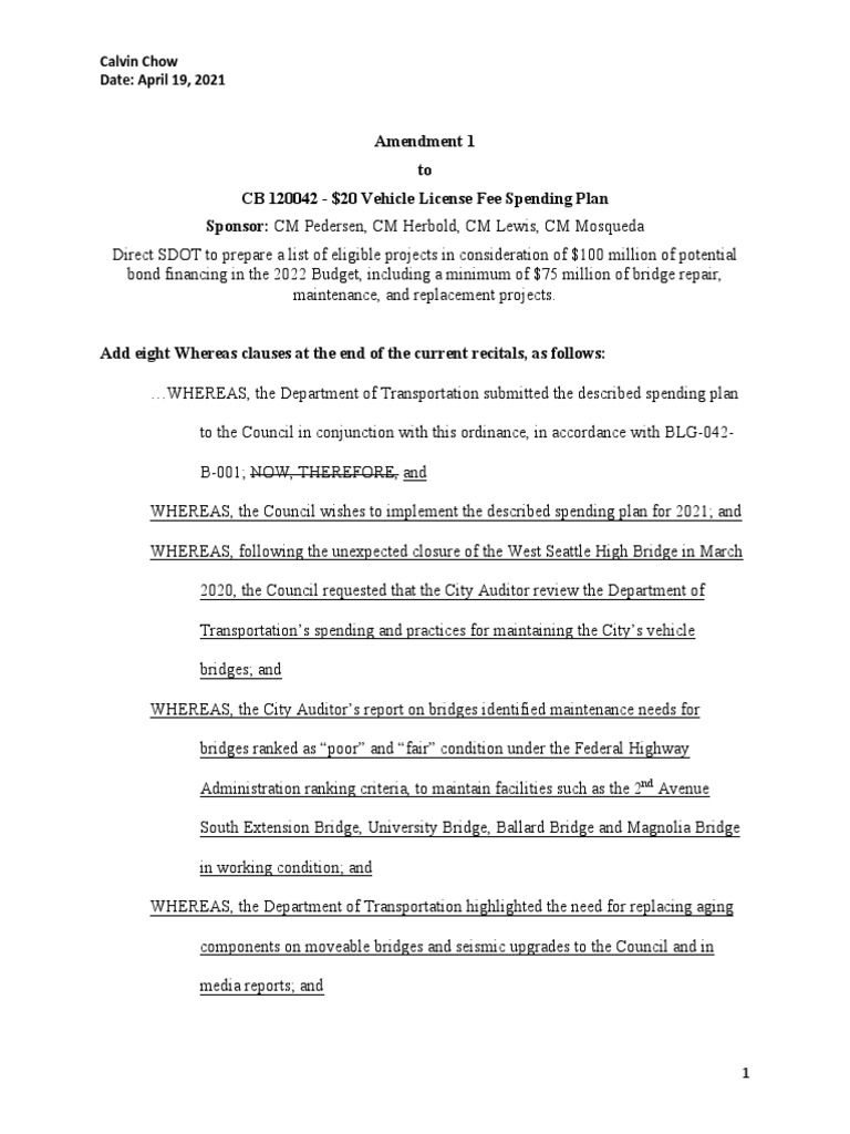 Amendment 1 to CB 120042 - $20 Vehicle License Fee Spending Plan Sponsor: