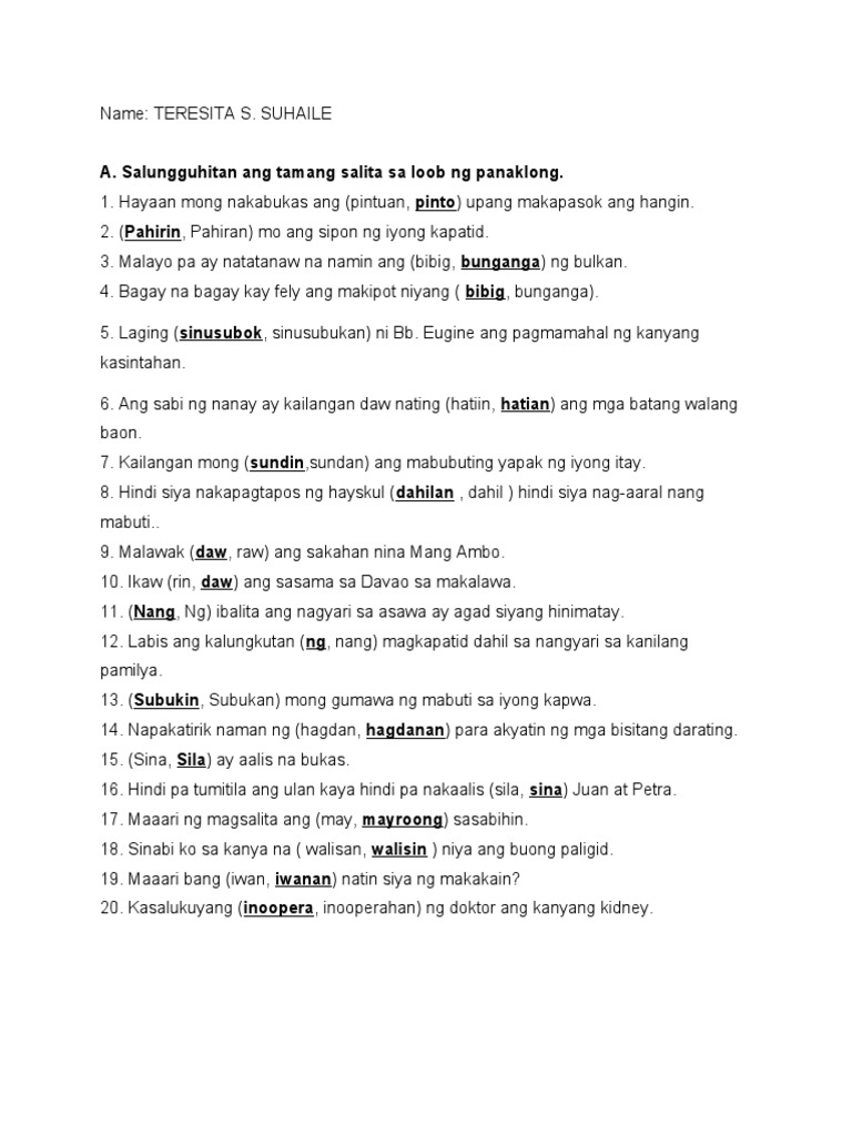 A. Salungguhitan ang tamang salita sa loob ng panaklong.