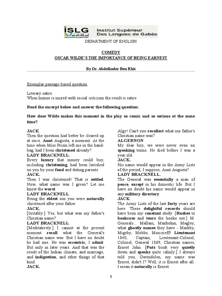society. Jack may be Ernest, but he is not earnest. Wilde offers an interesting