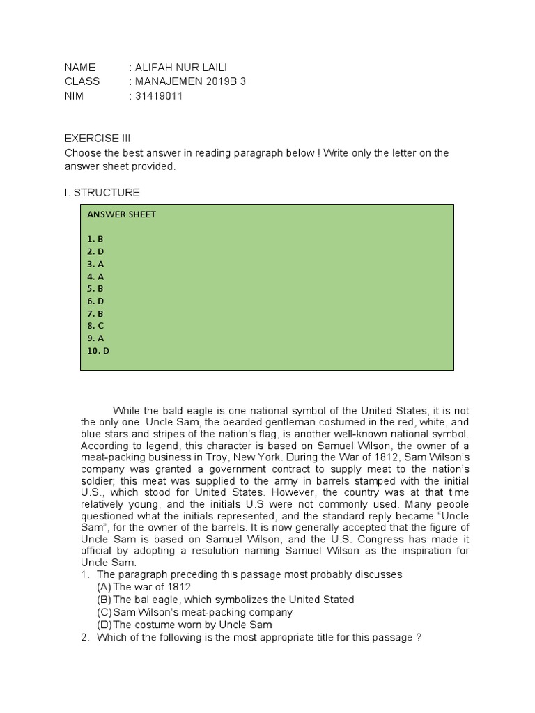 Choose the best answer in reading paragraph below ! Write only the letter on the