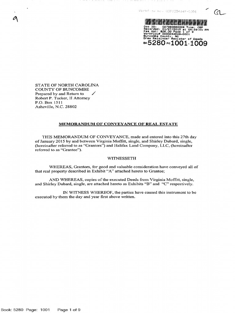Virginia Moffitt and Shirley Dubard, grantors, to Halifax Land Company, grantee, recorded 1/27/2015, Buncombe County. Obtained by Asheville Watchdog, www.avlwatchdog.org