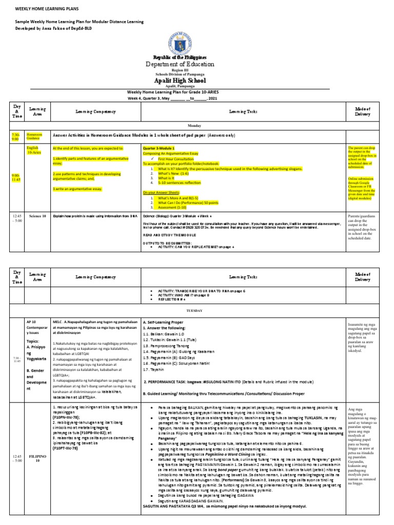 Sample Weekly Home Learning Plan for Modular Distance Learning