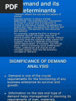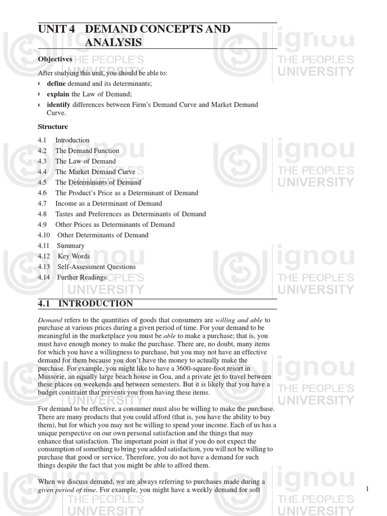 This document provides an introduction to demand concepts and analysis. It defines demand and explains that demand refers to the quantity of goods consumers are willing and able to purchase at various prices during a given time period. It then outlines the objectives of the unit which are to define demand and its determinants, explain the law of demand, and identify the differences between a firm's demand curve and market demand curve. The document goes on to introduce the different sections that will be covered related to demand concepts and analysis.
