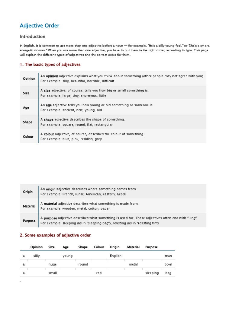 energetic woman.” When you use more than one adjective, you have to put them in the right order, according to type. This page