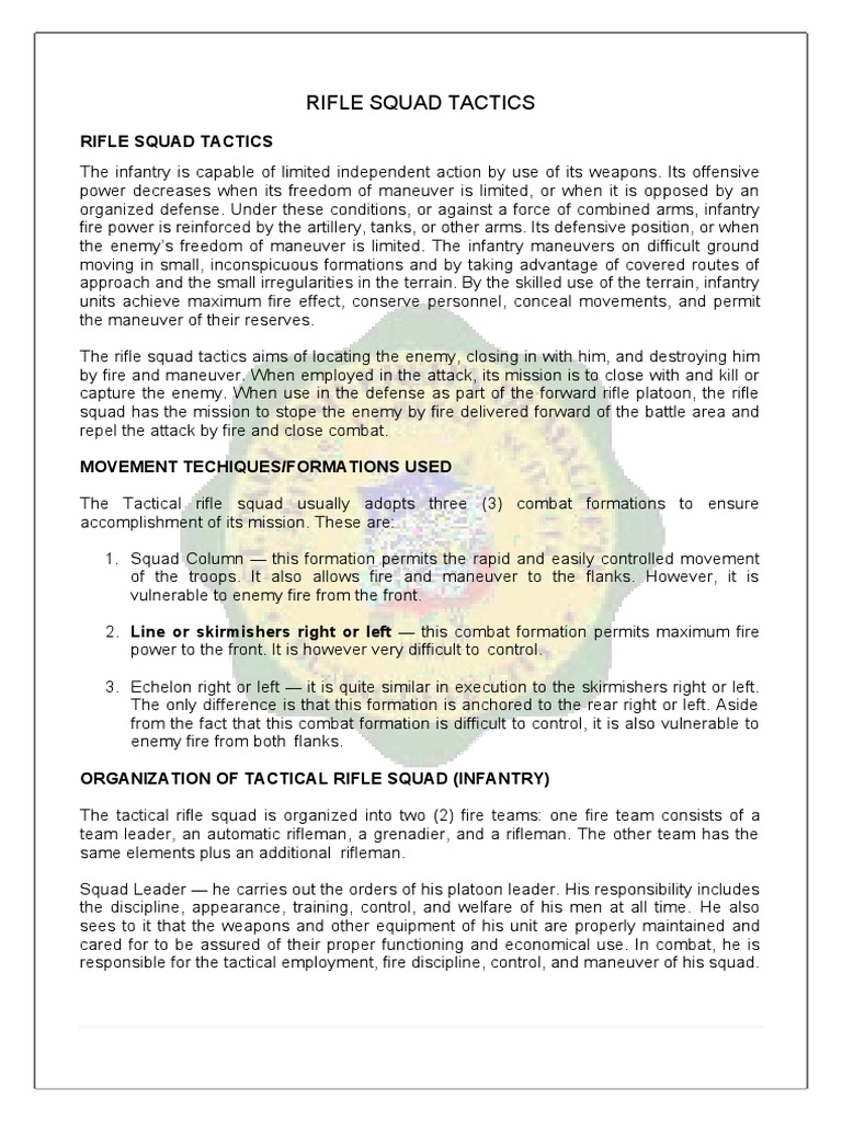 The Tactical rifle squad usually adopts three (3) combat formations to ensure