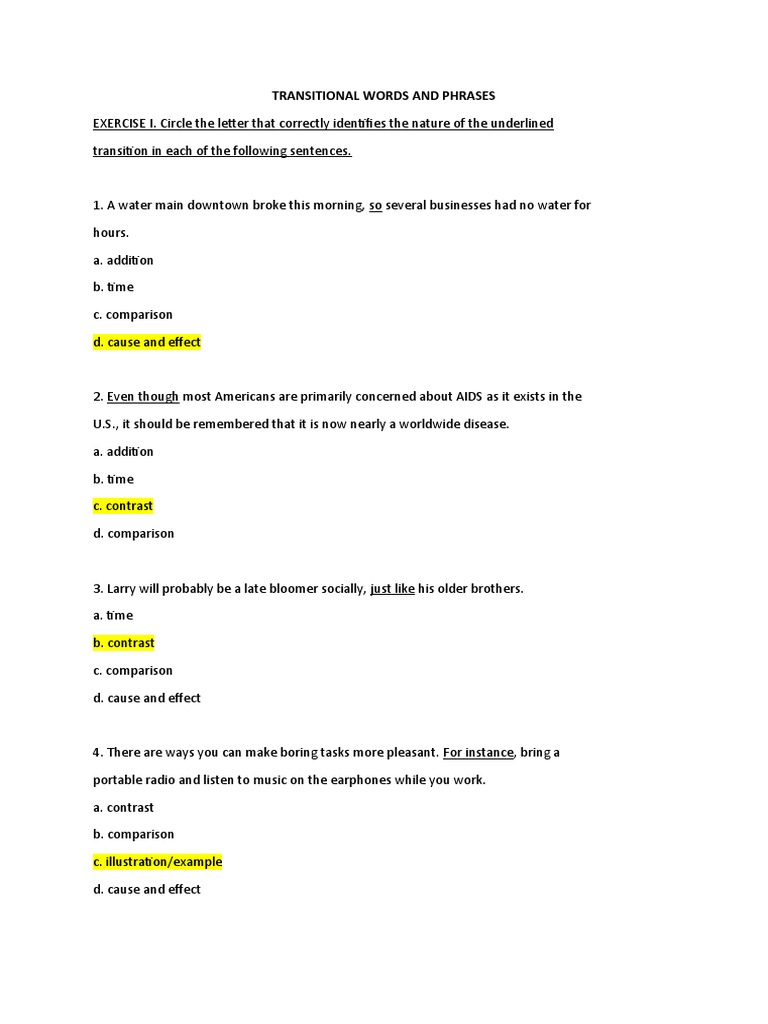 EXERCISE II. Circle the letter of the word that correctly identifies the appropriate transition word or