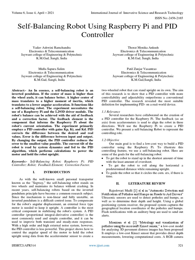 Keywords:- Self-Balancing Robot; Raspberry Pi; PID with the least amount of overshoot.