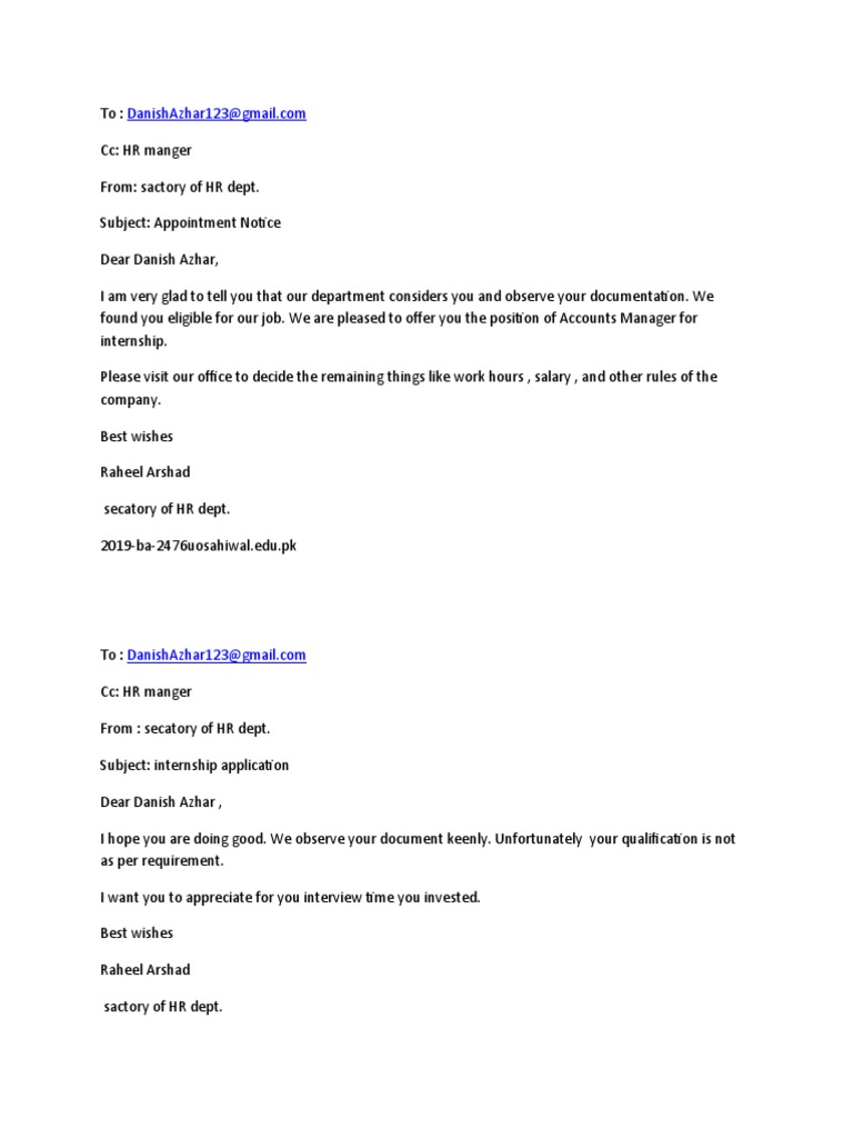 From : secatory of HR dept.