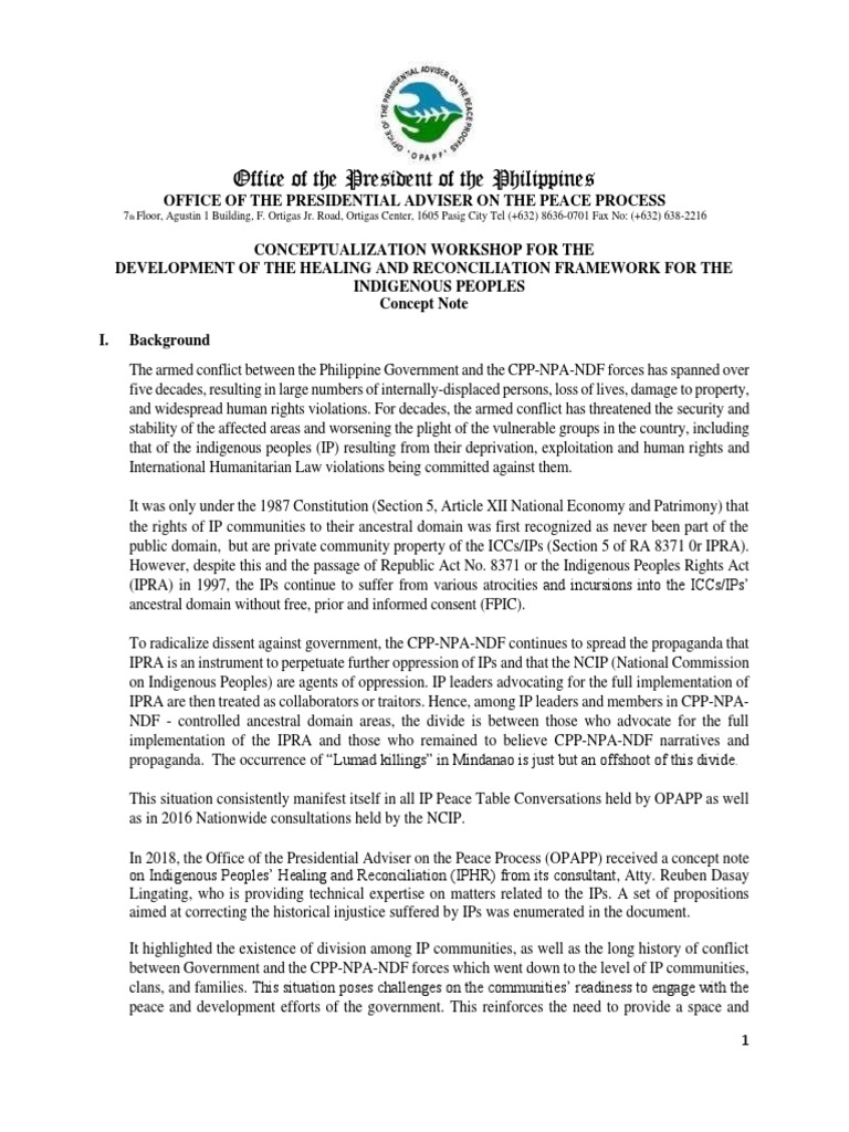 In 2018, the Office of the Presidential Adviser on the Peace Process (OPAPP) received a concept note