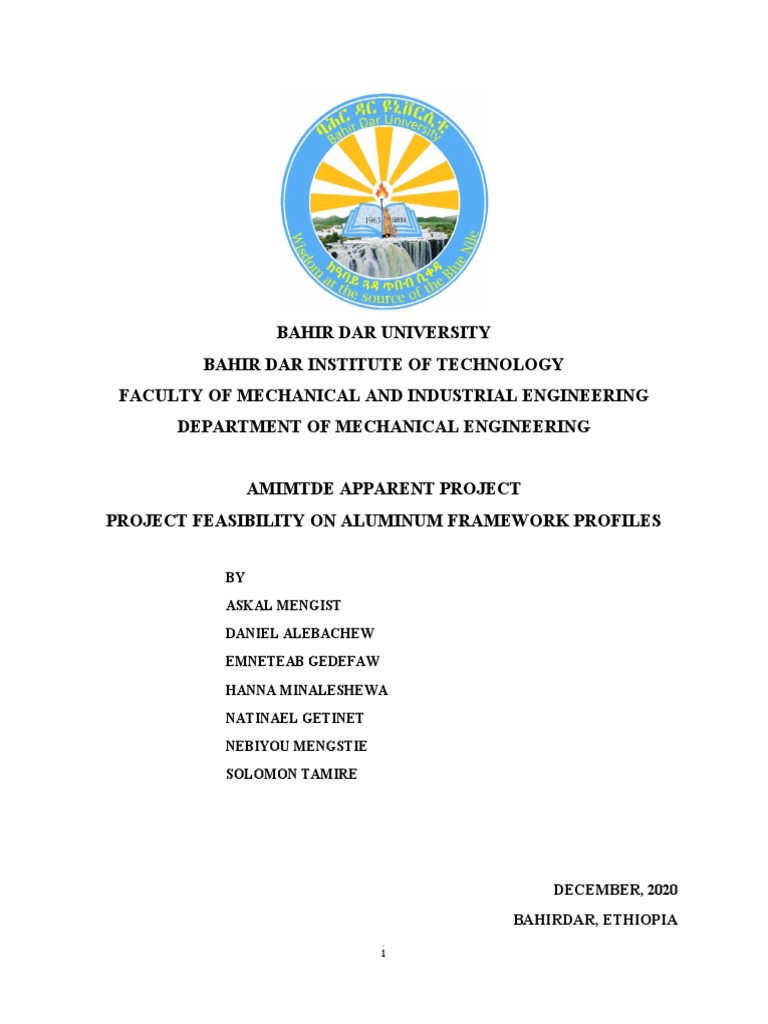 Bahir Dar University Bahir Dar Institute of Technology Faculty of Mechanical and Industrial Engineering Department of Mechanical Engineering